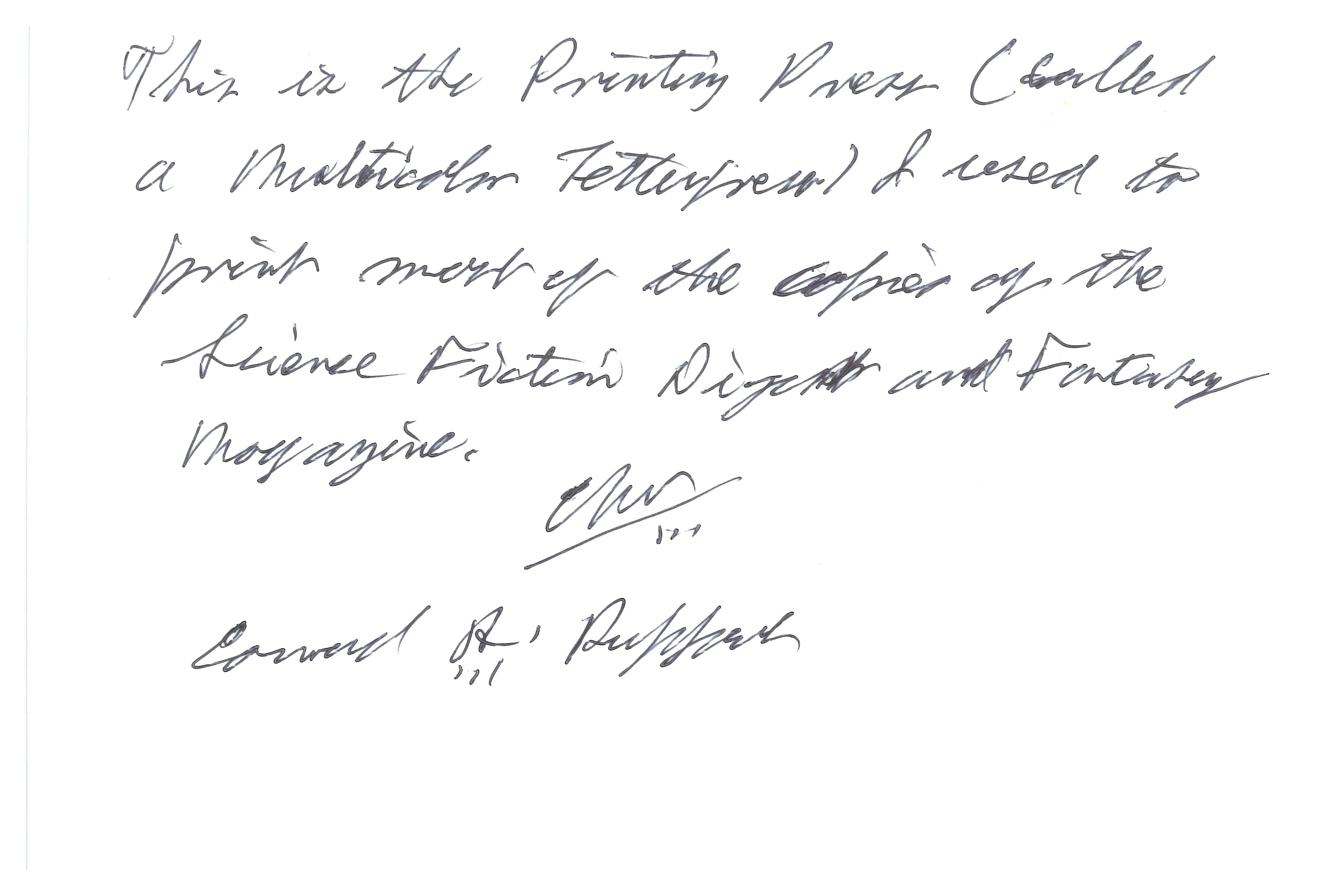 I enjoyed working on the magazine, but it was necessary for me to begin making a real living, so I bought a linotype machine and started a business called Ruppert Printing Service. I printed many types of jobs, but was always interested in ones having to do with science. I remember printing some of the early issues of Astronautics, which was the magazine of the American Rocket Society. This work led me to do some printing for Willy Ley. I remember being contacted by a well-known author’s agent and author named Otis Adelbert Kline. For several years he had me print a number of circulars. I soon didn’t have much extra time for typesetting Fantasy Magazine, and Julie agreed to take over as the editor. He and Mort kept the magazine going for a while longer and had it printed by William H. Crawford, a Pennsylvania fan.