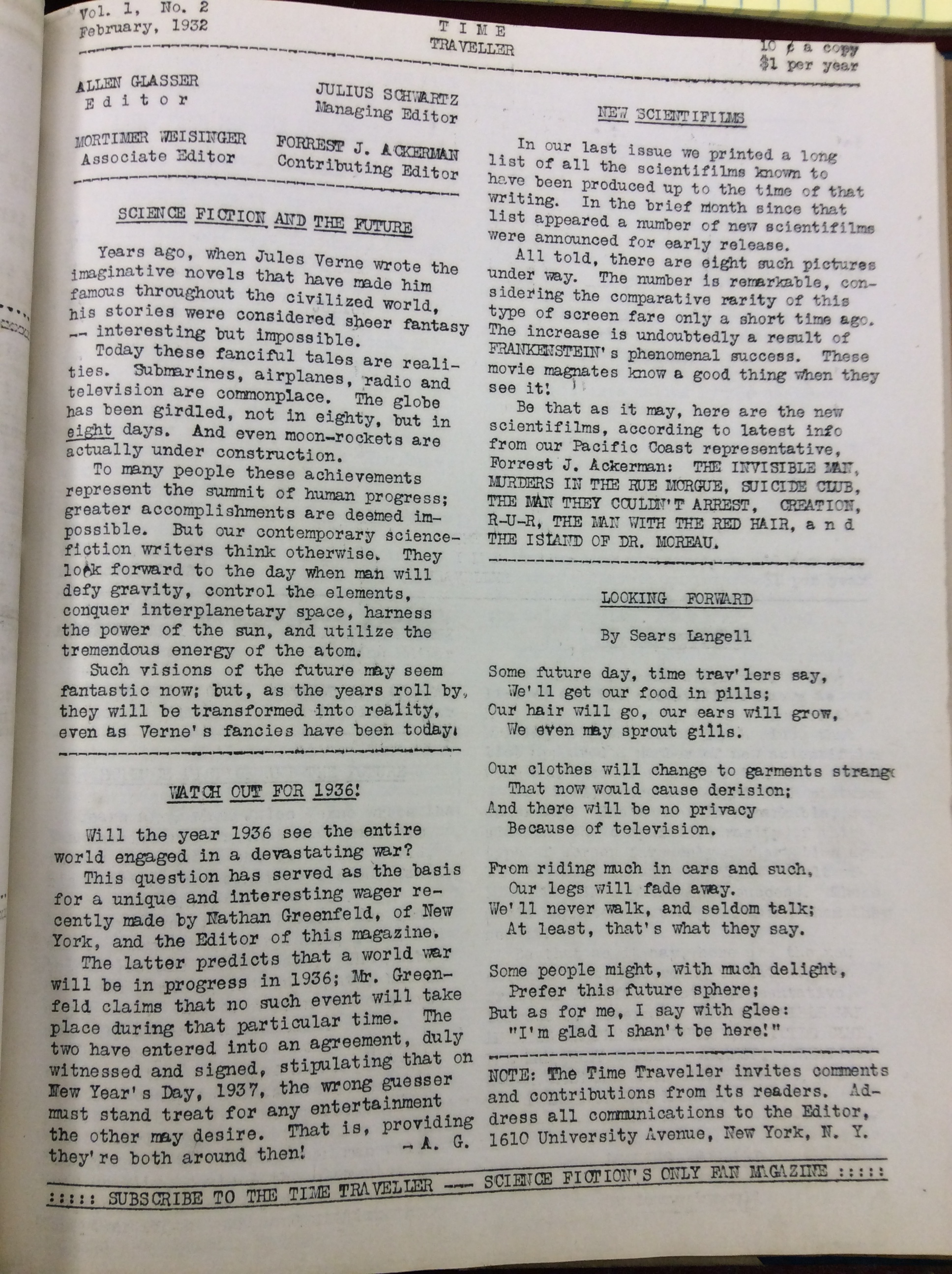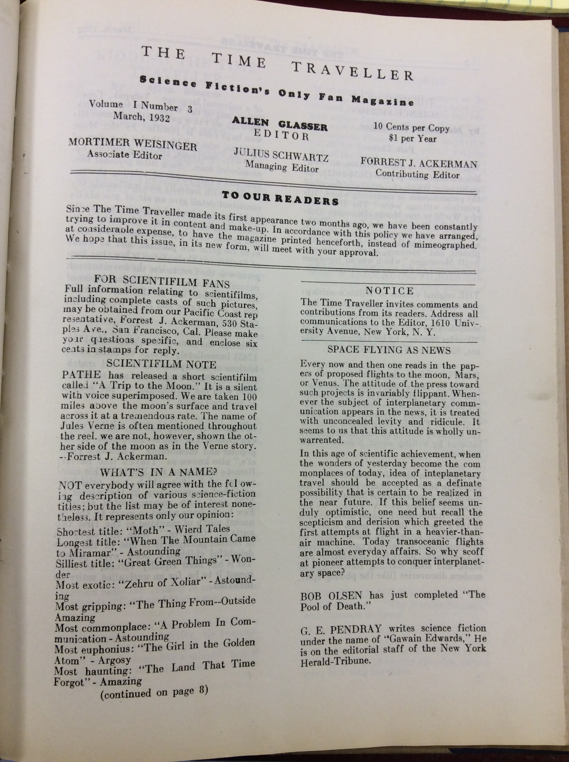 It was around this time that I saw an advertisement for a monthly science fiction fan magazine by the name of The Time Traveller. I sent in a subscription to Allen Glasser, and soon received my copy of the second issue, dated February 1932, which I liked very much. I recall that it was mimeographed, and I thought that it would look a lot nicer if it were printed. I contacted Glasser, and after a couple of meetings, it was decided that I would begin printing the magazine with the third issue.