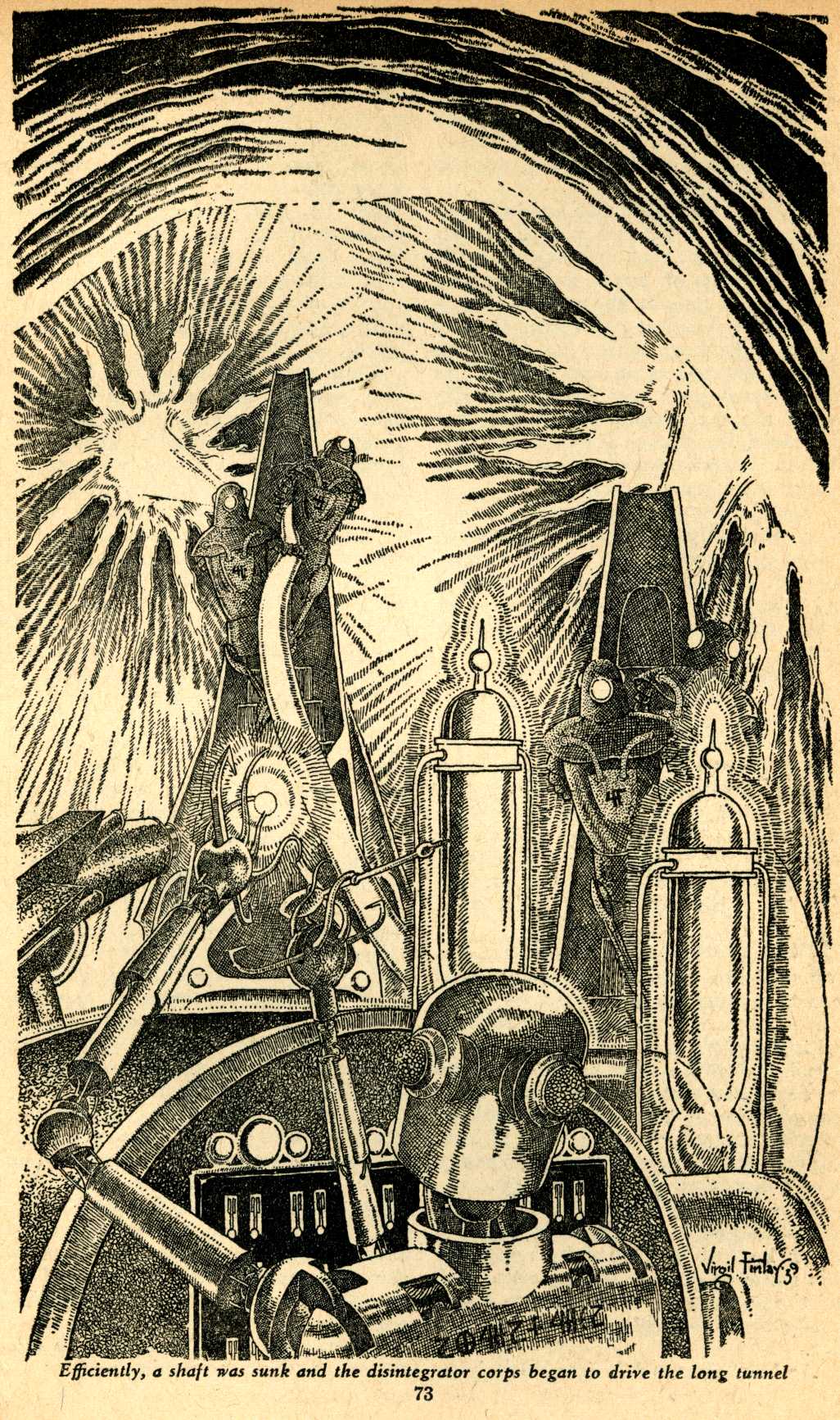 Efficiently, a shaft was sunk and the disintegrator corps began the drive the long tunnel. And along that hellish thoroughfare – thru its searing heat, its raging back-blast of disintegrator-gas, the little army of robots moved steadily and relentlessly forward at an even speed of five miles per hour. On and on, each intelligent mechanism energized by its own tight beam from the power plant.