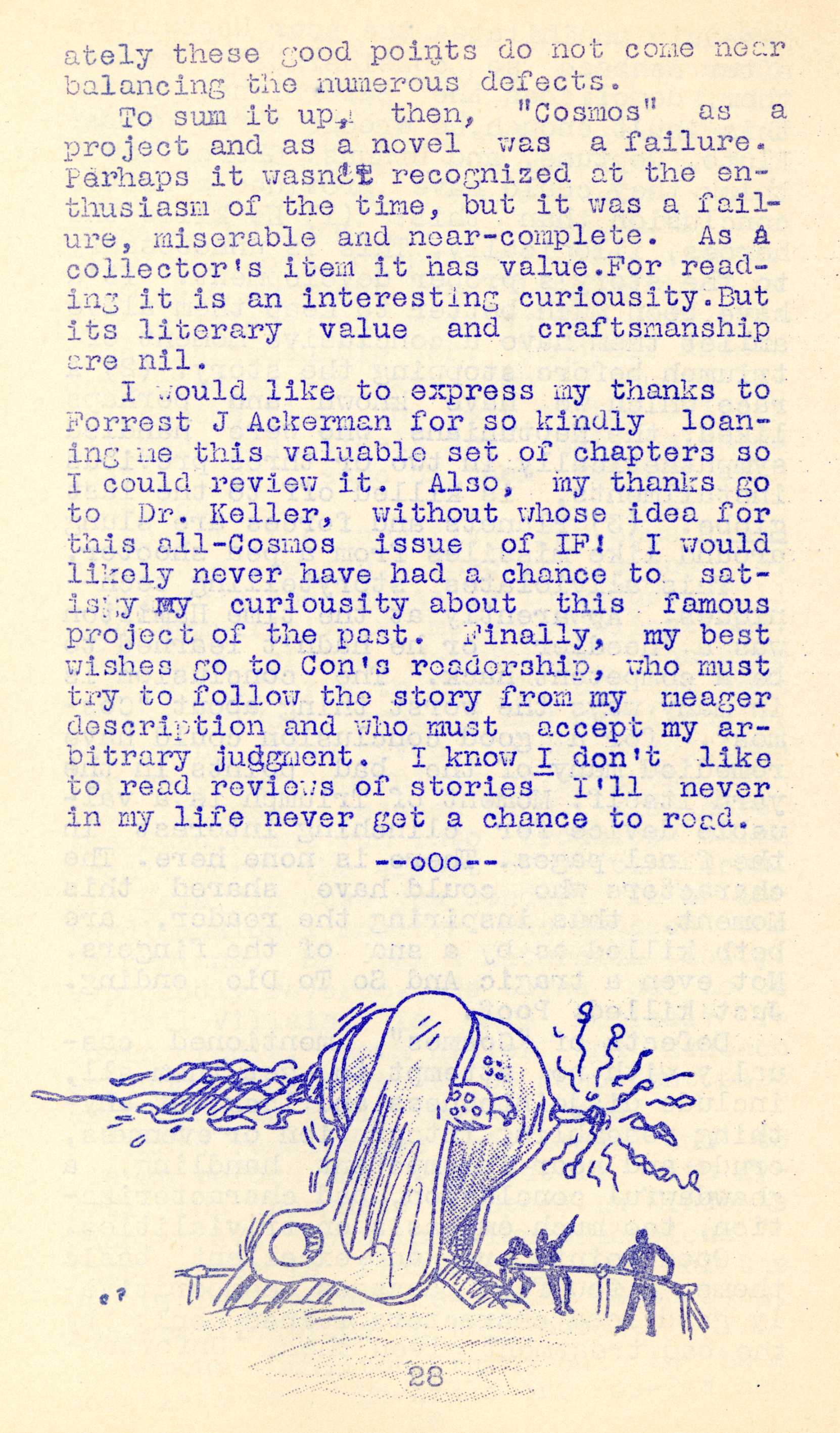 I would like to express my thanks to Forrest J Ackerman for so kindly loaning me this valuable set of chapters so I could review it. Also, my thanks go to Dr. Keller, without whose idea for this all-Cosmos issue of IF! I would likely never have had a chance to satisfy my curiosity about this famous project of the past. Finally, my best wishes go to Con’s readership, who must try to follow the story from my meager description and who must accept my arbitrary judgment. I know I don’t like to read reviews of stories I’ll never in my life get a chance to read.