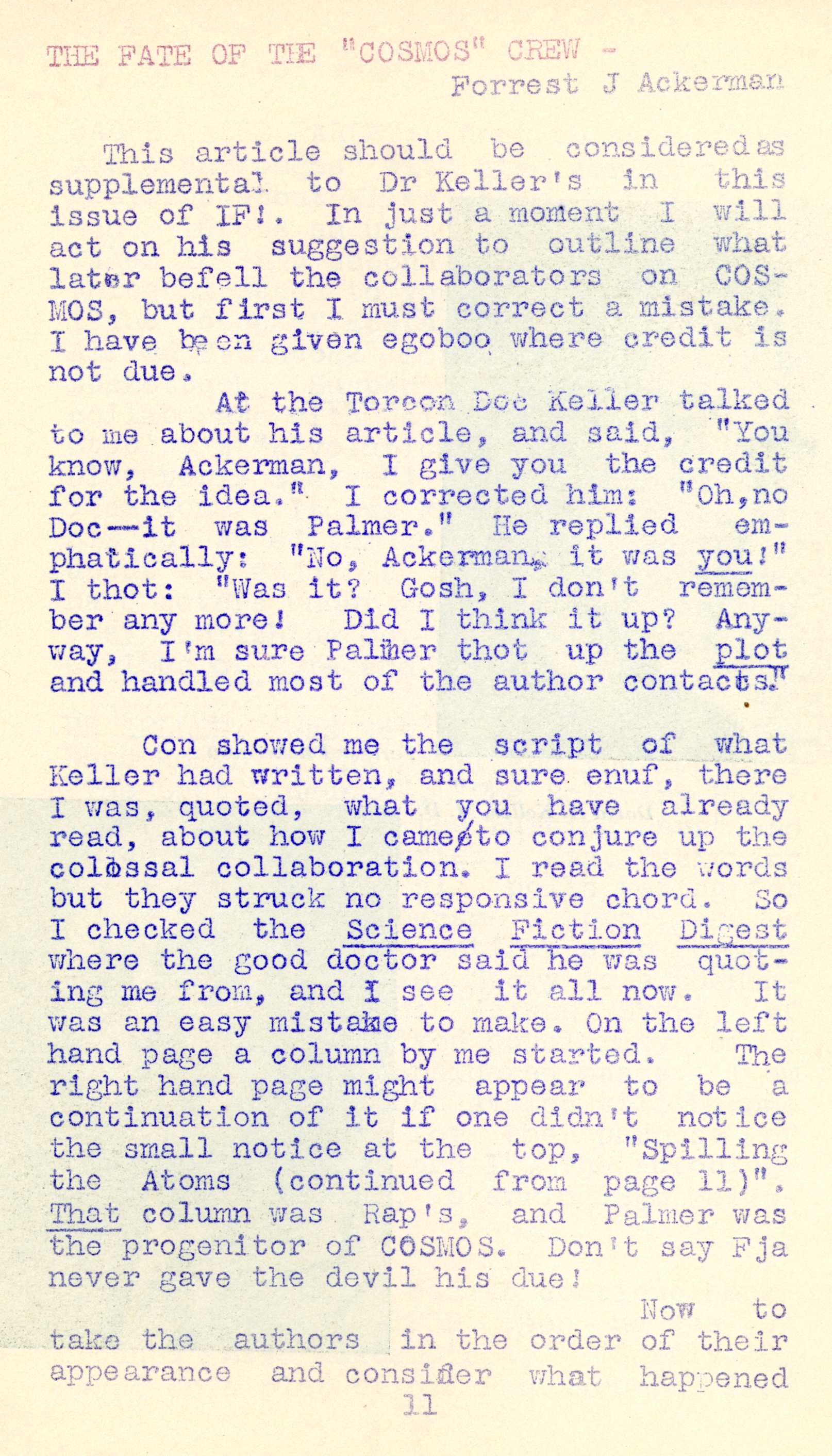 At the Torcon Doc Keller talked to me about his article, and said, “You know, Ackerman, I give you credit for the idea.” I corrected him: “Oh, no Doc – it was Palmer.” He replied emphatically: “No, Ackerman, it was you!” I thot: “Was it? Gosh, I don’t remember any more! Did I think it up? Anyway, I’m sure Palmer thot up the plot and handled most of the author contacts.”