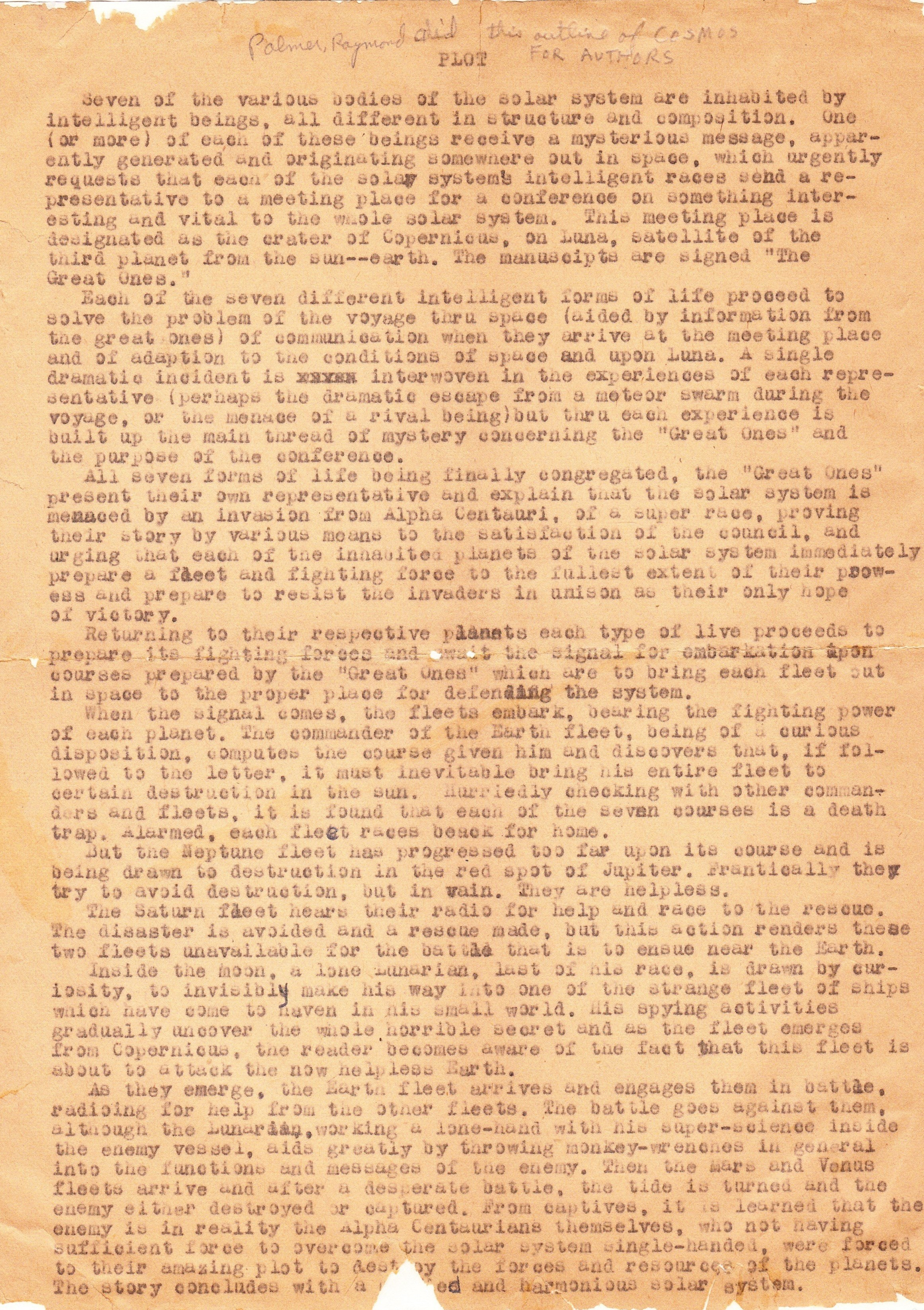 After an intensive search of collectors’ hordes and library archives, it appeared that Palmer’s original plot outline hadn’t survived. Fortunately, science fiction fans tend to preserve everything. In the course of research for another project, leading historian Alistair Durie mentioned that he had exactly this document. With his kind permission, it’s shown in full here.
