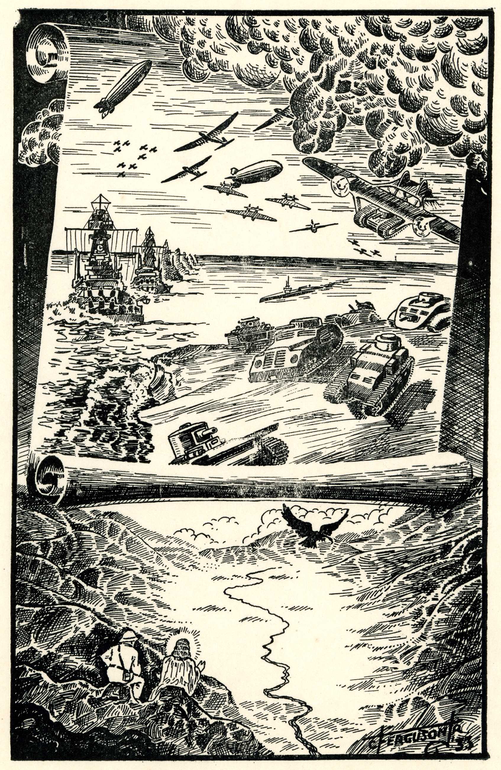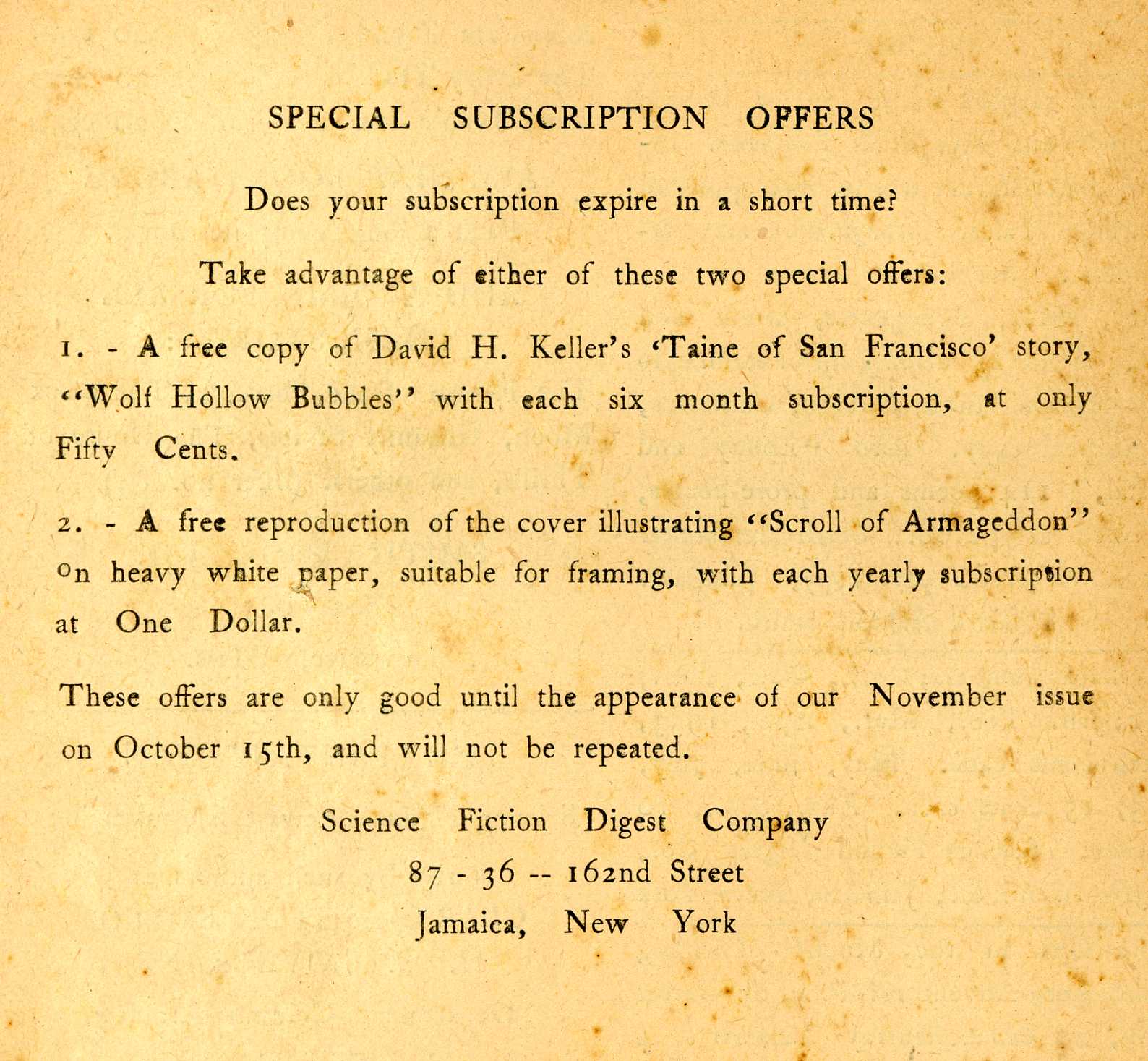 The October 1933 issue brought us the first ever illustration, drawn by Clay Ferguson for the story The Scroll of Armageddon by Arthur J. Burks, the first part of which appears inside. Jesus intervenes in the troubled Middle East… The image to the left is a premium version of the cover illustration, offered for subscribers through an ad on the back cover (below right). This copy is from the collection of Forrest J Ackerman. Unfortunately the transfer of the image to the cover of the actual issue was of poor quality.
