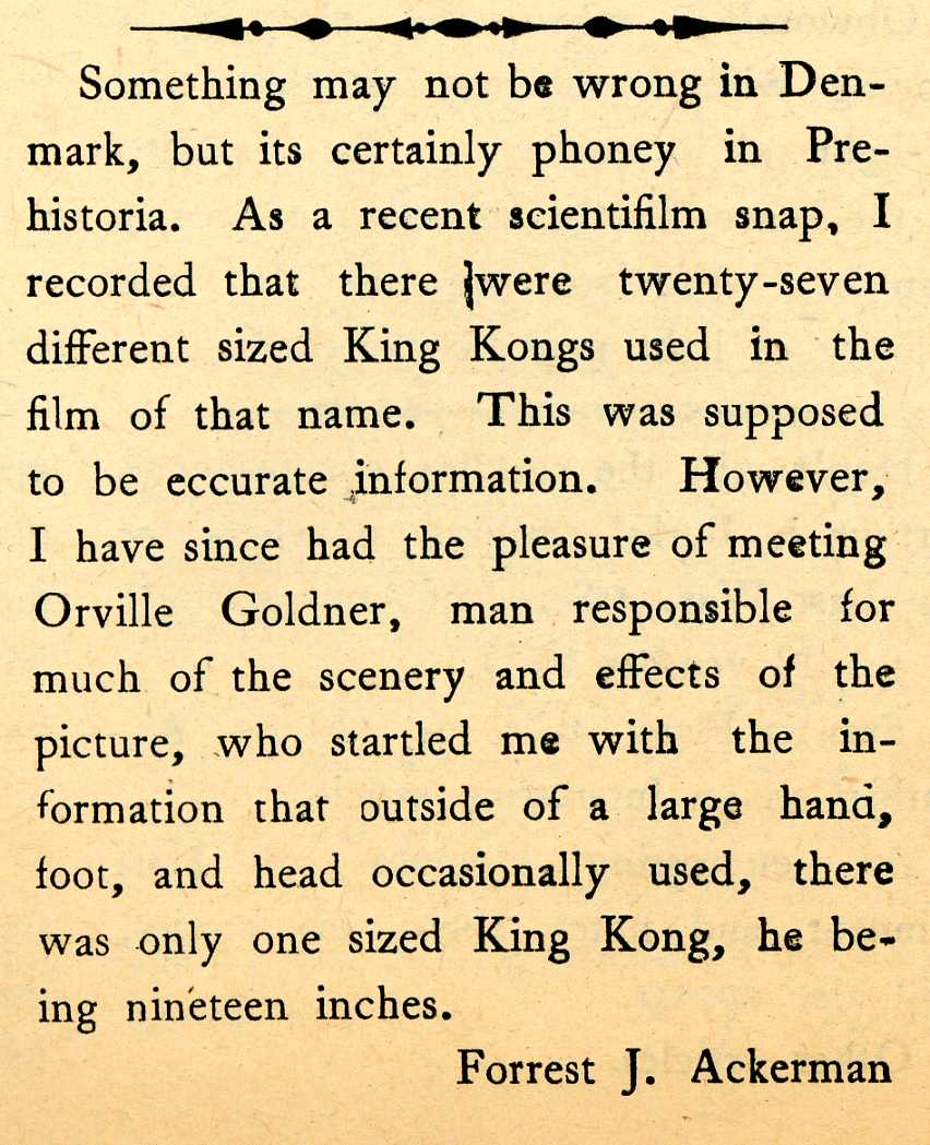 Forrest J Ackerman was honing the Hollywood reporting style that was to become his hallmark in later years. Interesting to note that his middle initial appears here with a period following, which he explicitly disavowed. According to filmmaker Paul Davids, who purchased Mr. Ackerman’s birth certificate along with other papers, Forry’s given name was “Forest James Ackerman” — one “r”. Forry is quoted as saying, “I thought the ‘ames’ was too ordinary, so I just used the J.” By the time of his death, Forry had acquired many of the original props used in the original 1933 King Kong movie, including the mechanical stegosaurus and brontosaurus models used in the classic battle scene.