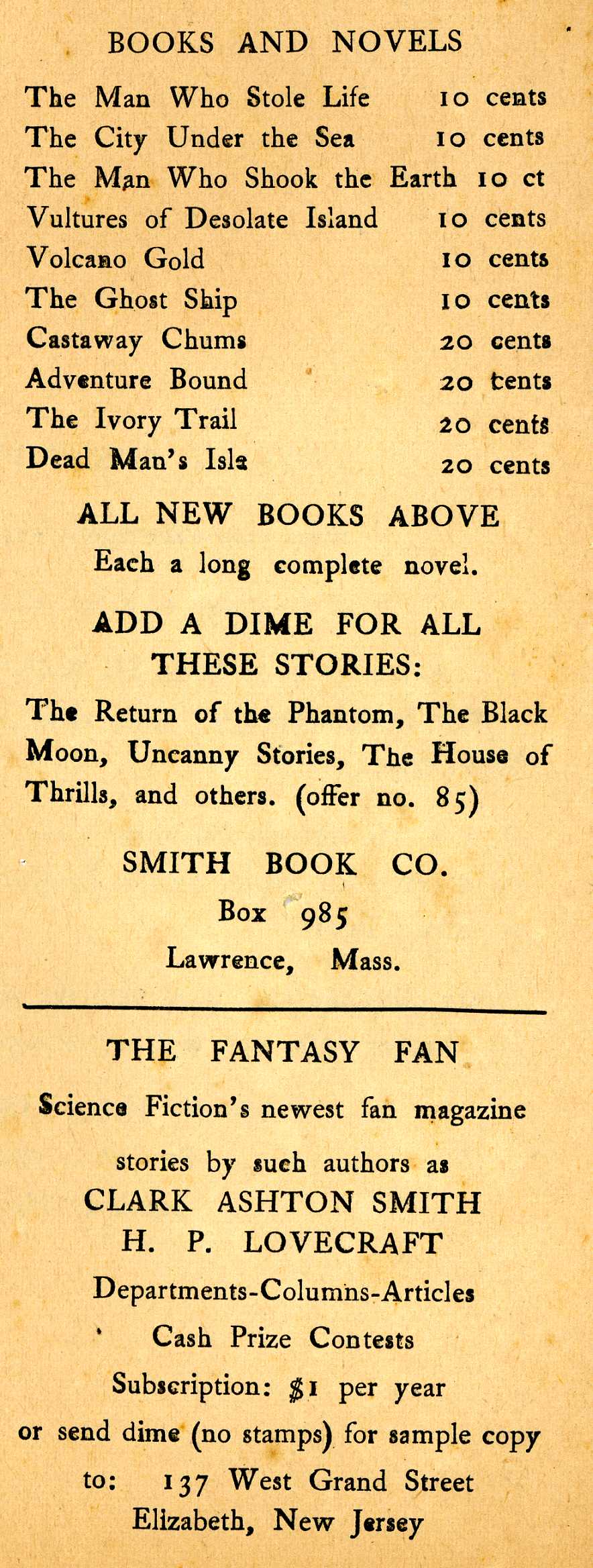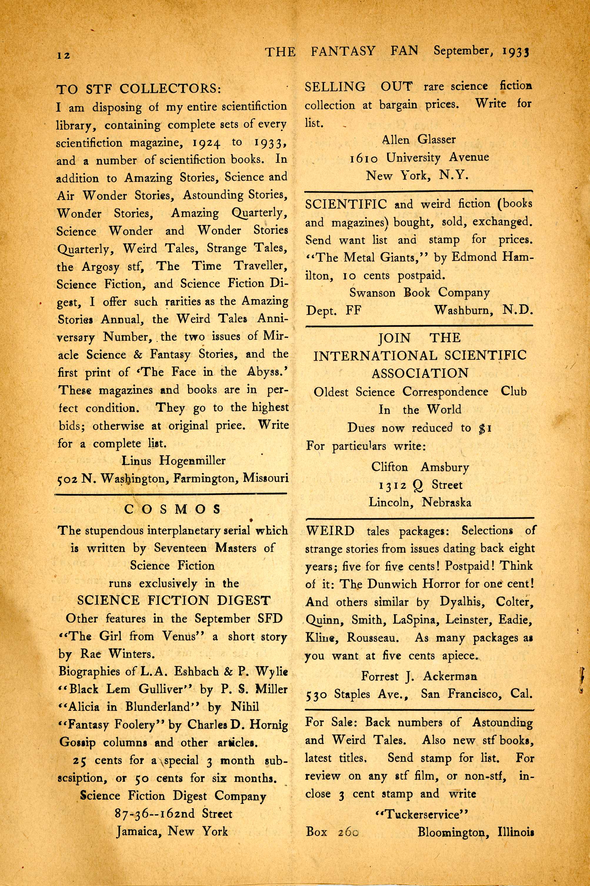 ore akin to those in Weird Tales than the hard science fiction found in Amazing Stories and Astounding. Initially it seemed that there would be a clear separation between the two magazine, as The Fantasy Fan explicitly disavowed publishing science fiction. The initial issue included articles by Julius Schwartz and Forrest Ackerman. COSMOS was advertised on the back page of TFF. But as we’ll see in coming issues, the editors of SFD soon began to recognize the overlap between the fan bases and extend their own coverage into the realms of the weird as well.