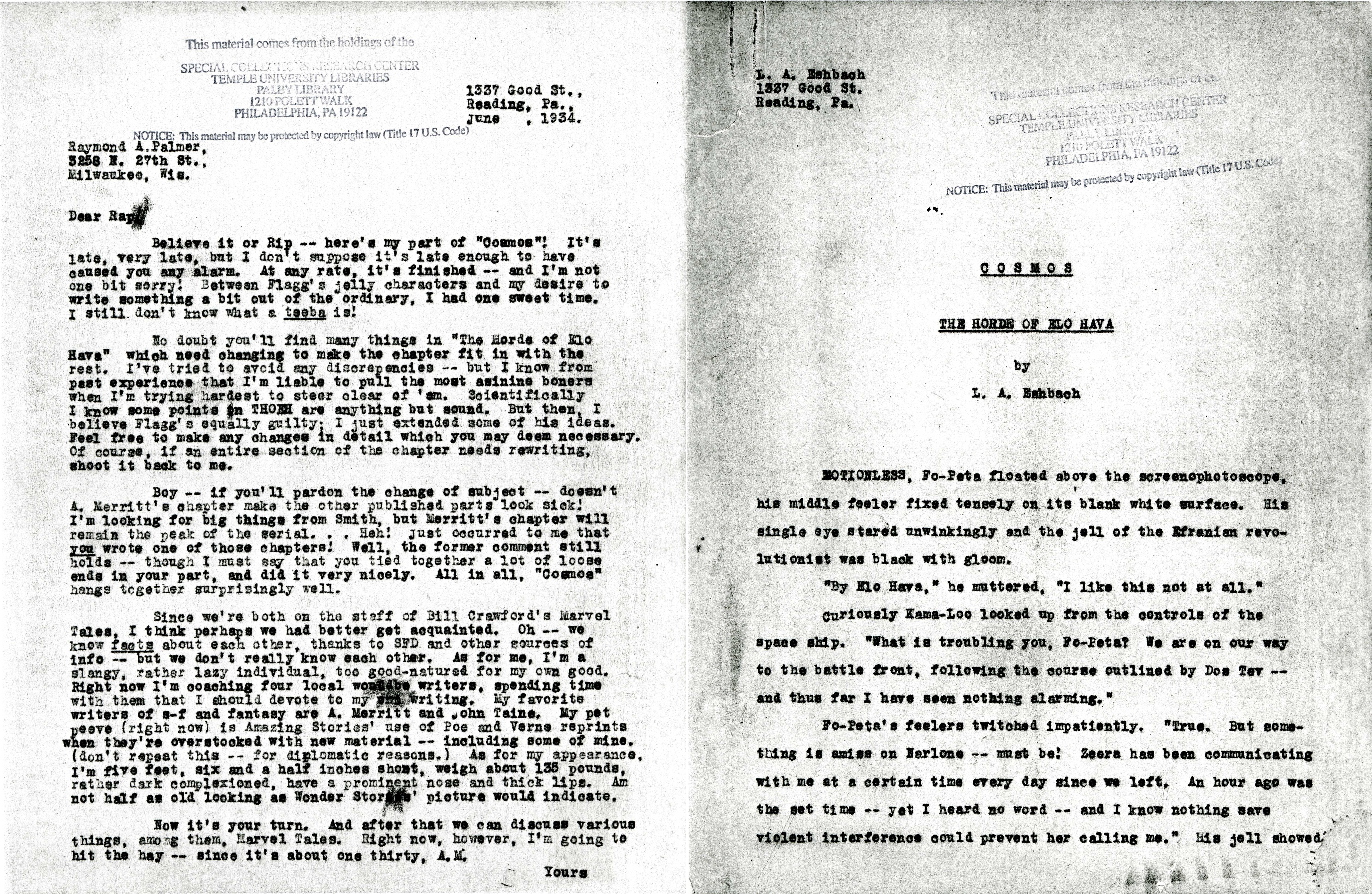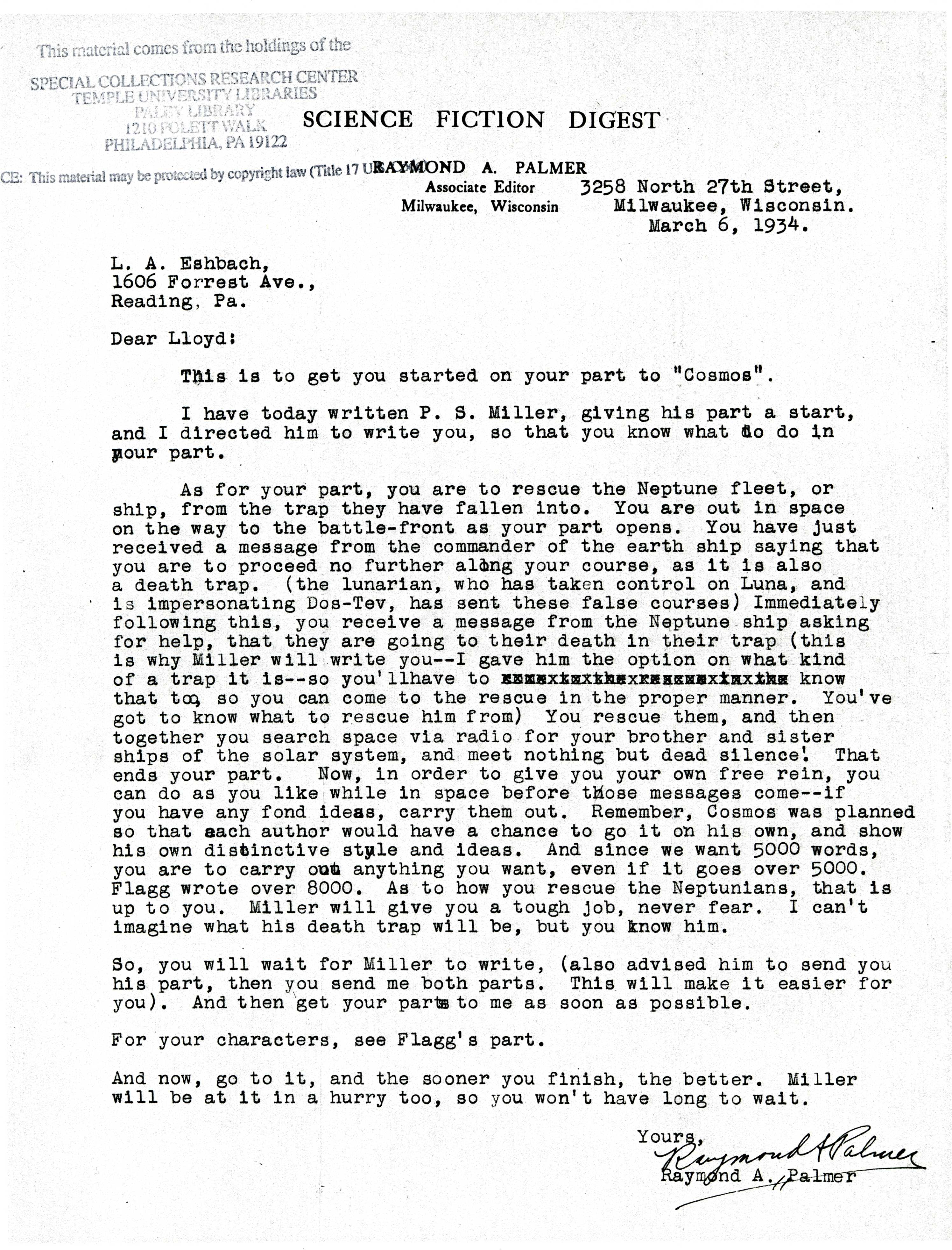 Unfortunately, Eshbach’s papers do not contain the correspondence soliciting his involvement in Cosmos. He obviously agreed to contribute a chapter, and in March of 1934, Ray Palmer gave Eshbach the plot context for his installment. Notable in this letter is Palmer’s comment, “Remember, Cosmos was planned so that each author would have a chance to go it on his own, and show his own distinctive style and ideas.”