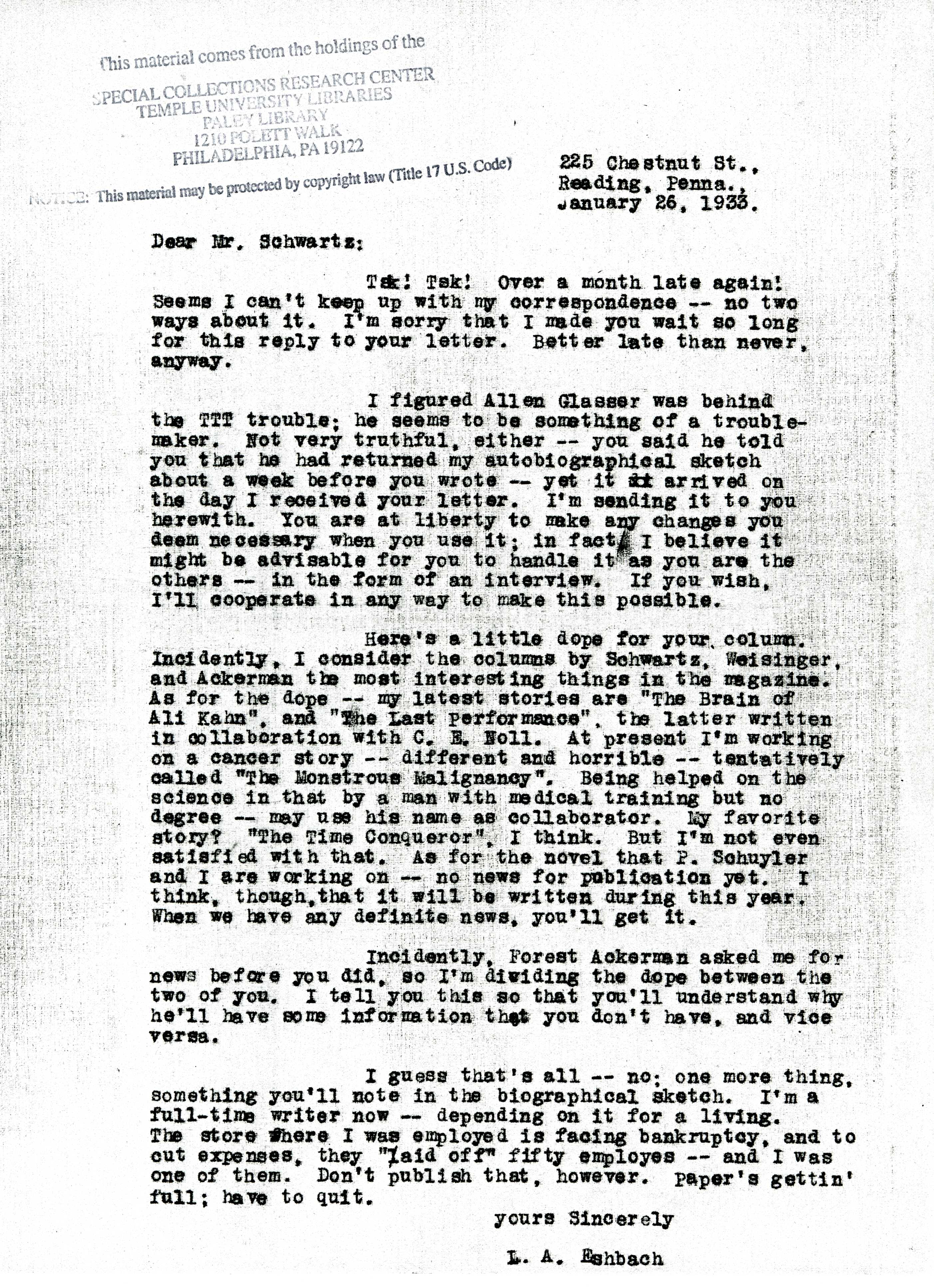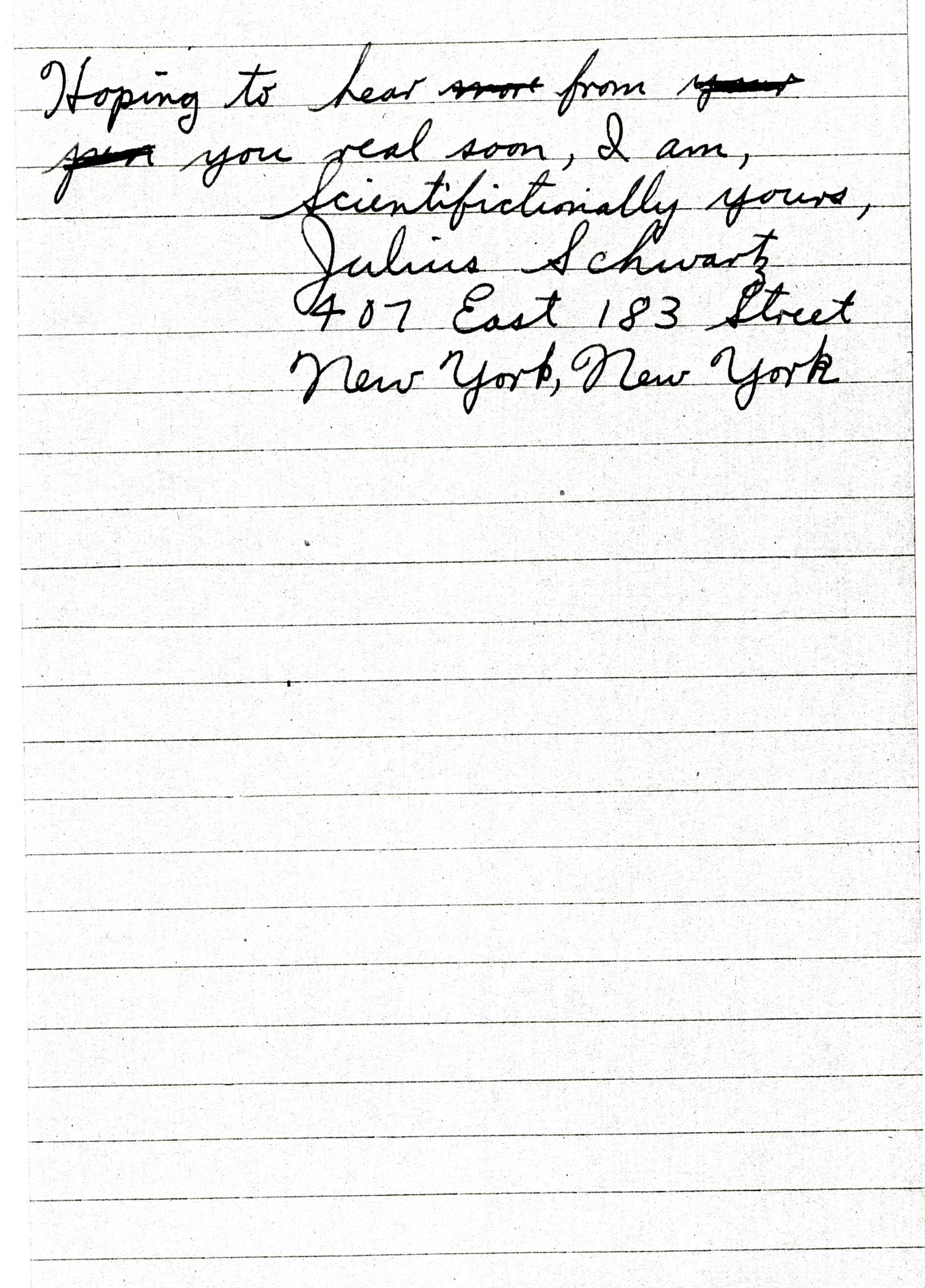 Here Schwartz says, “Perhaps you will remember that about a year ago, I sent you a letter asking for a biography of yourself…” We can see how the editors collected the tidbits of science fiction gossip that were the staples of their magazine. Through a steady stream of correspondence, patiently tapped out and sent by post, the social media of these days managed to connect a rapidly growing fan community with the information it craved.