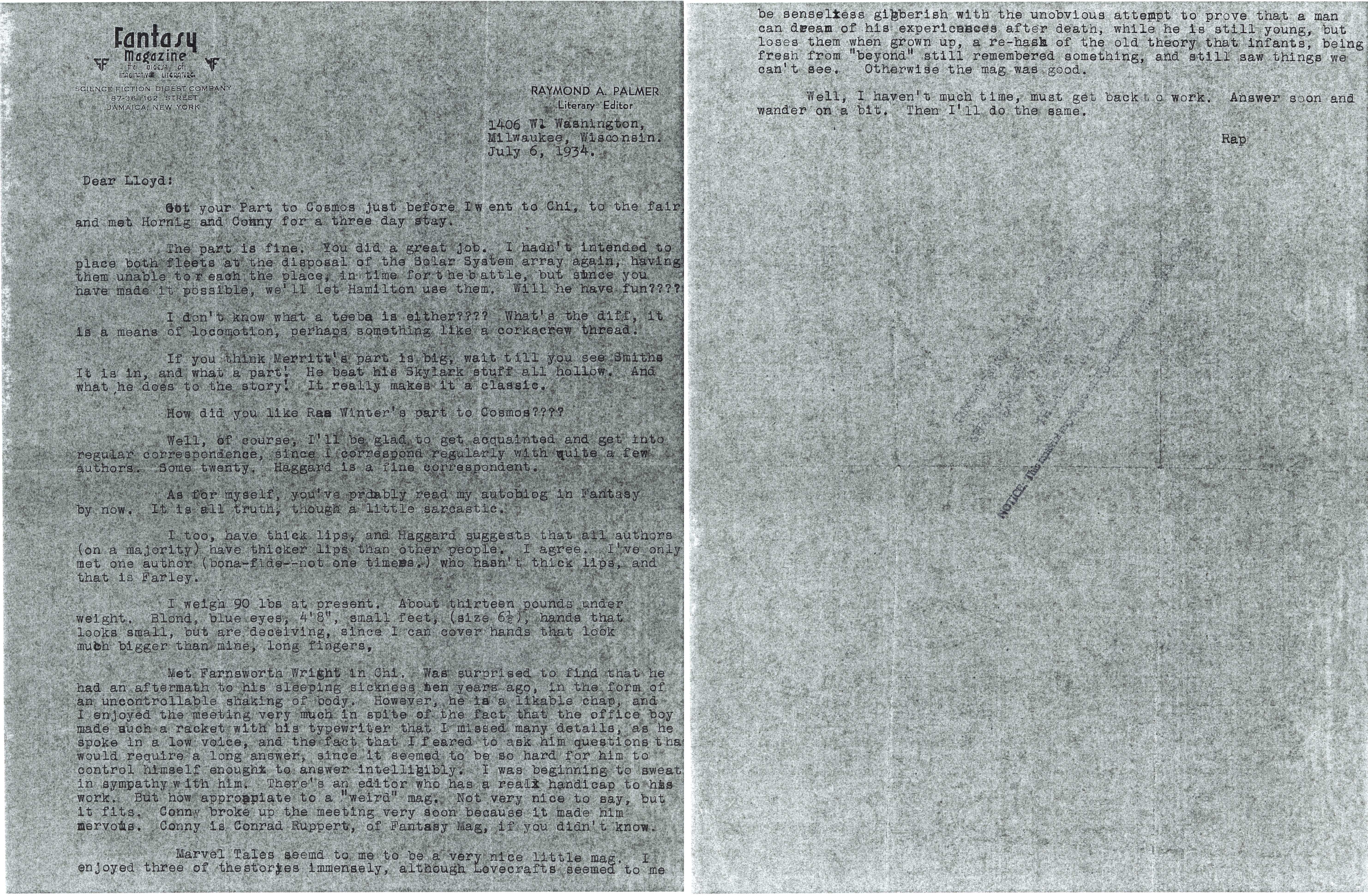 Palmer accepted Eshbach’s chapter in a letter dated July 6, 1934. Interestingly, he queries, “How did you like Rae Winter’s part to Cosmos????” – which of course Palmer had written himself under that pseudonym. Rap had also shamelessly praised “Rae” in his December 1933 column accompanying the chapter. Insecurity? Passion for self promotion? Probably some of both. As for his commentary on the thick lips of all “bona fide” authors… I’ve got nothing.