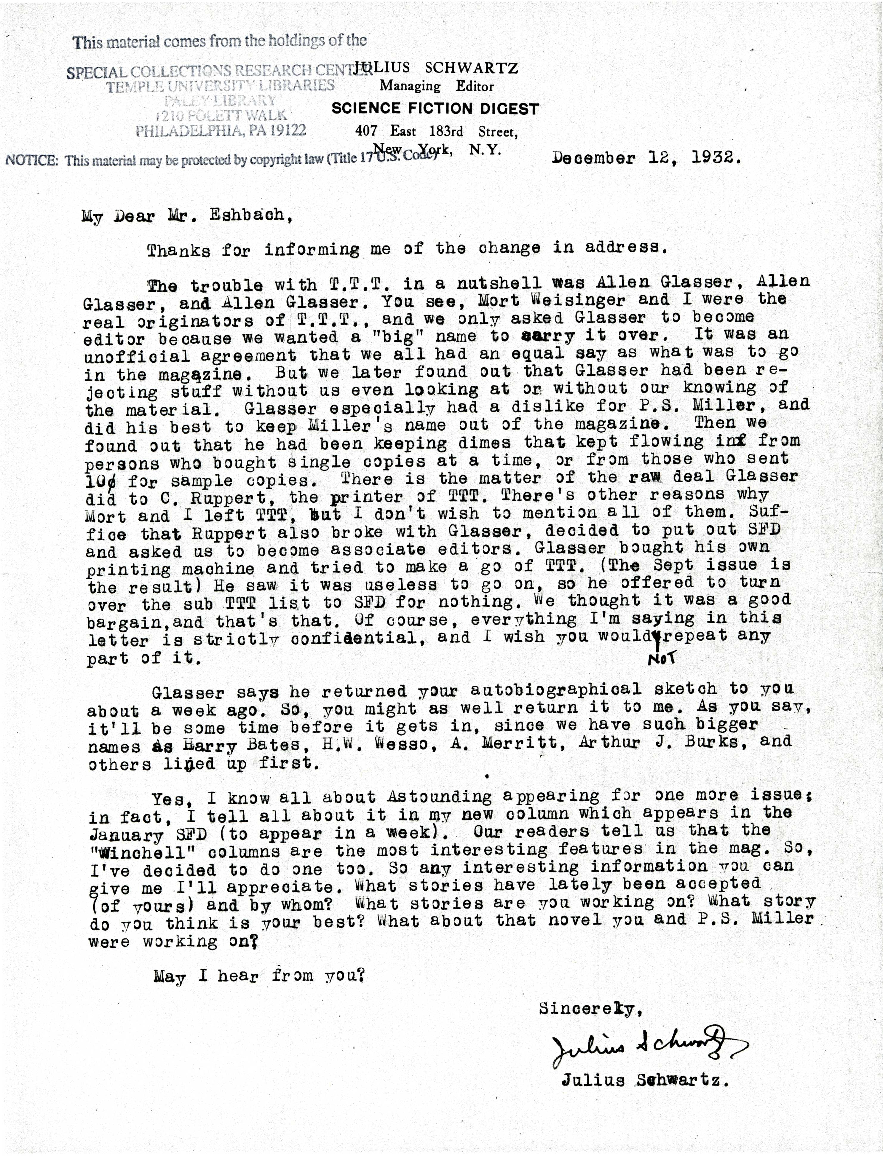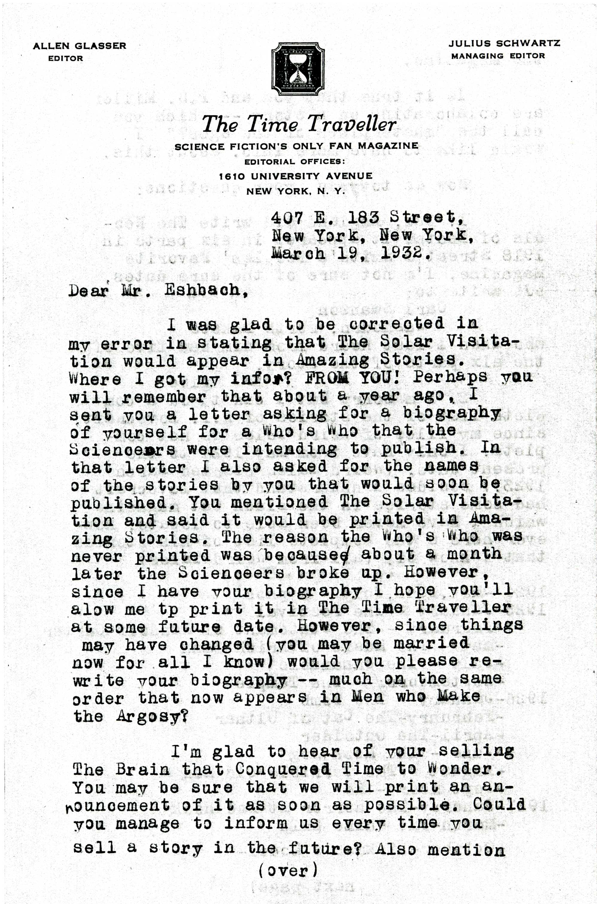 This early letter from Schwartz is undated, but it’s approximate origin is suggested in a March 19, 1932 letter to Eshbach, apparently in response to an Eshbach missive sent to The Time Traveler commenting on a column in the magazine.