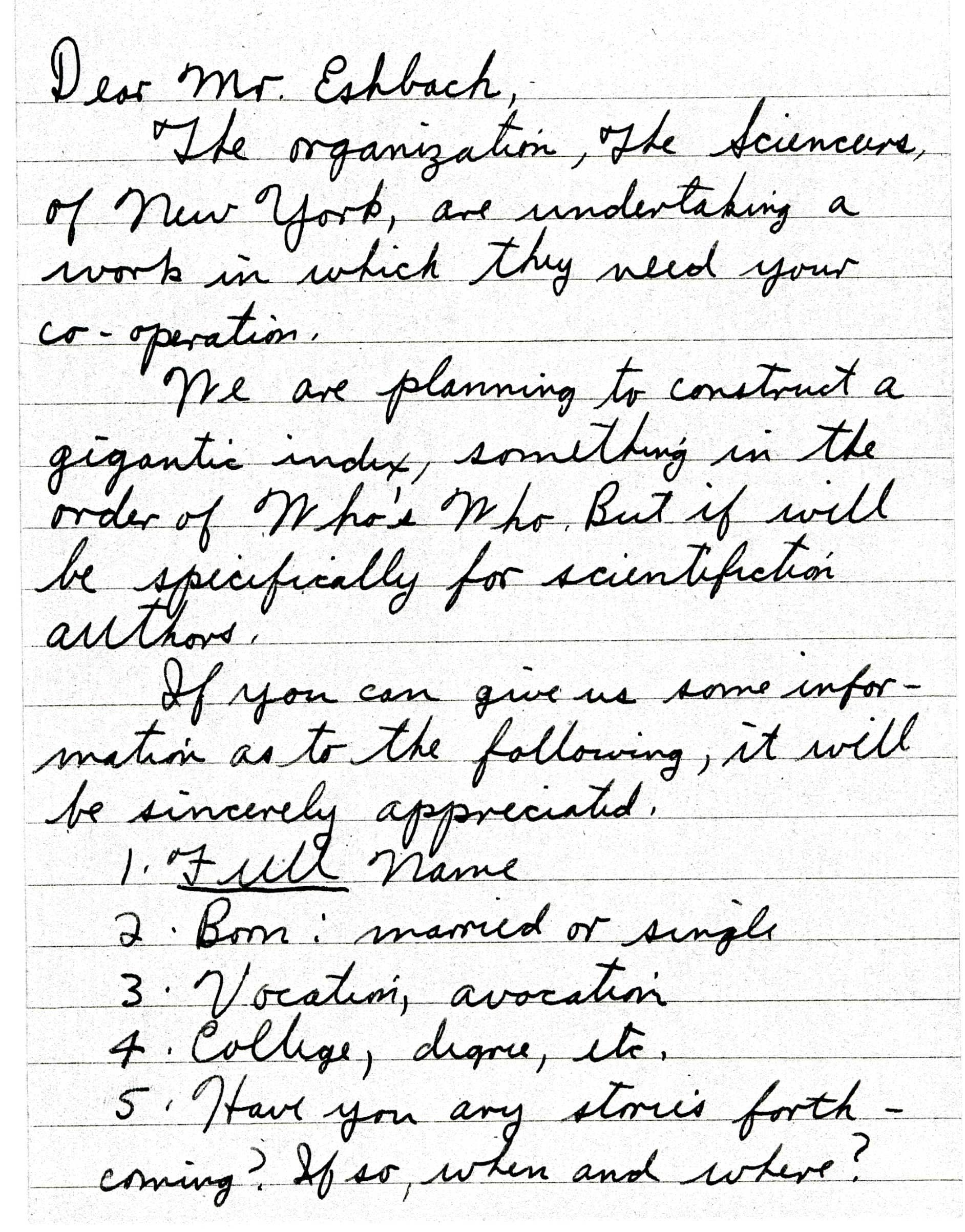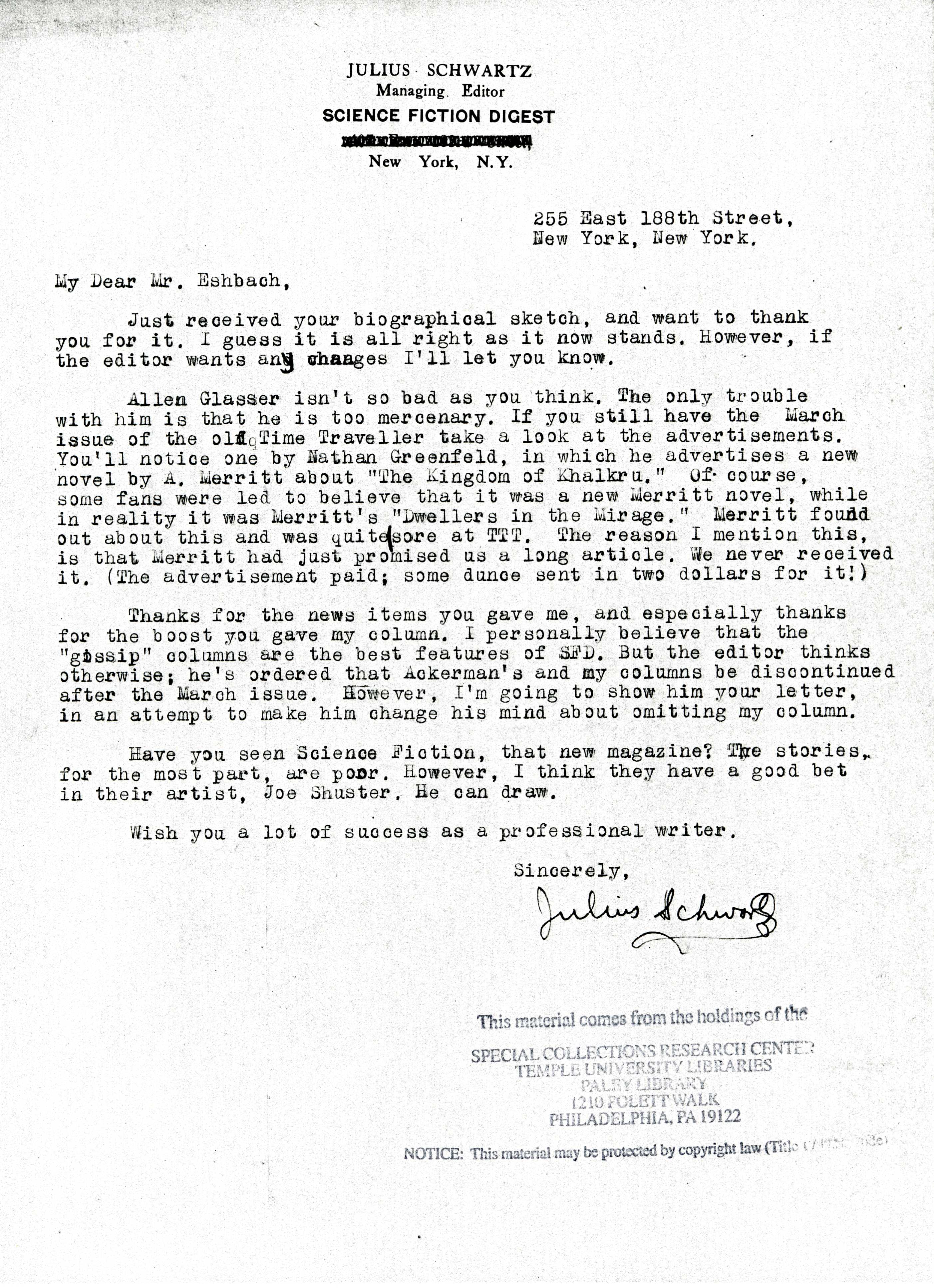 In early 1931, 15-year old Julius Schwartz wrote to Eshbach for the first time. This letter hints at just how ambitious Schwartz’s publishing aspirations were already; note his plan to “construct a gigantic index” of science fiction authors, “in the order of Who’s Who.”