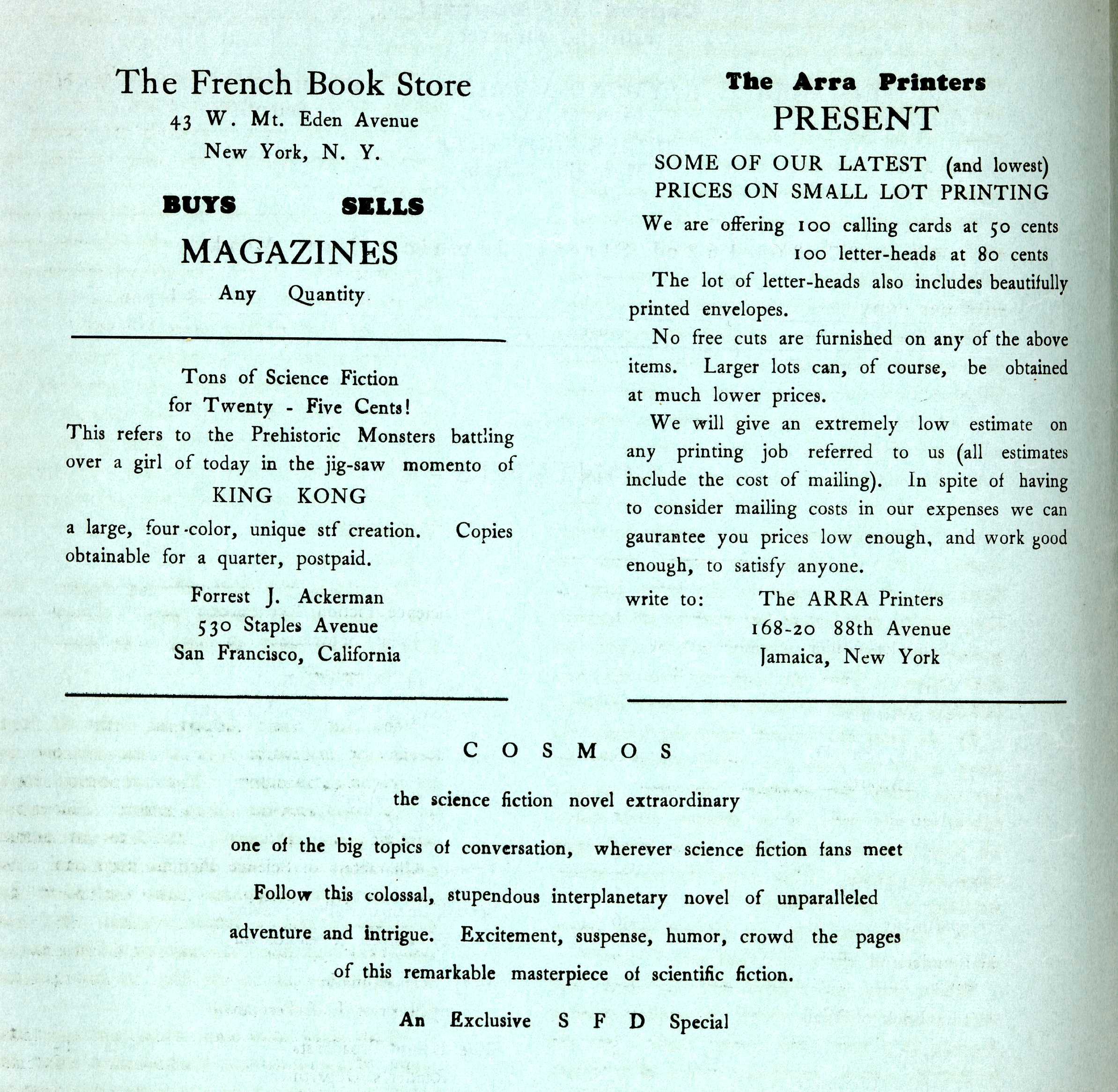 “COSMOS, which began last month with Ralph Milne Farley’s sensational first chapter, now includes John W. Campbell, Jr., in its imposing list of contributors. Thus, COSMOS will be written by seventeen authors, and not sixteen, as formerly announced.
