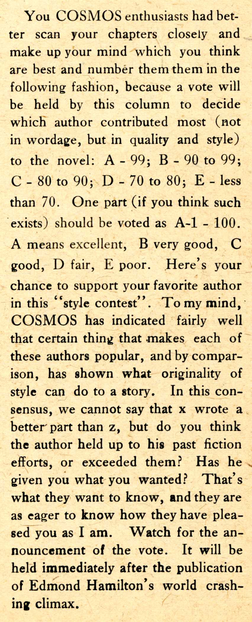In “Spilling the Atoms,” Rap announced a reader poll to establish which Cosmos author “has given you what you wanted.” The somewhat confusing instructions are shown at the right.