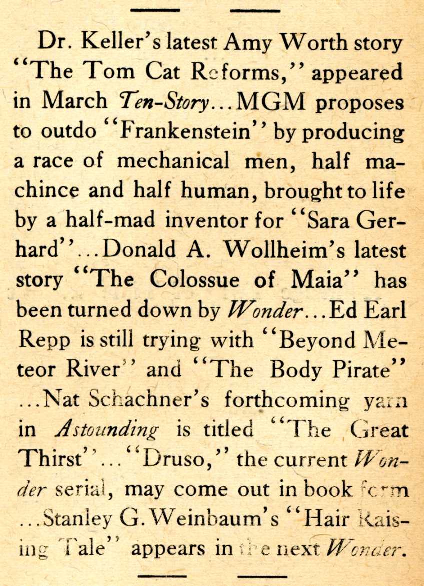 In the July issue there will be six pages of last minute scientifiction and scientifilm news and gossip, an interview with Laurence Manning, the remainder of the Cigarette Characterizations, a feature I am sure has proven a hit with everyone, and other interesting articles dealing with various phases of fantastic fiction. And the installment of COSMOS is by Edward E. “Skylark” Smith!