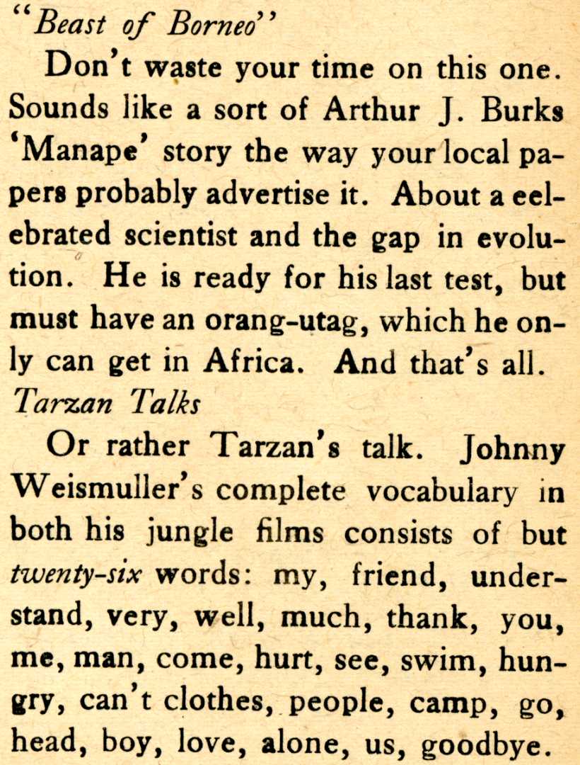 For many readers, the core value of Fantasy Magazine remained the news and reviews columns. The lively, humorous pieces by Ackerman (“Scientifilm Snapshots,” on the left) and Schwartz (“The Science Fiction Eye,” on the right) brought a sense of being on the inside of the rapidly-evolving genre.