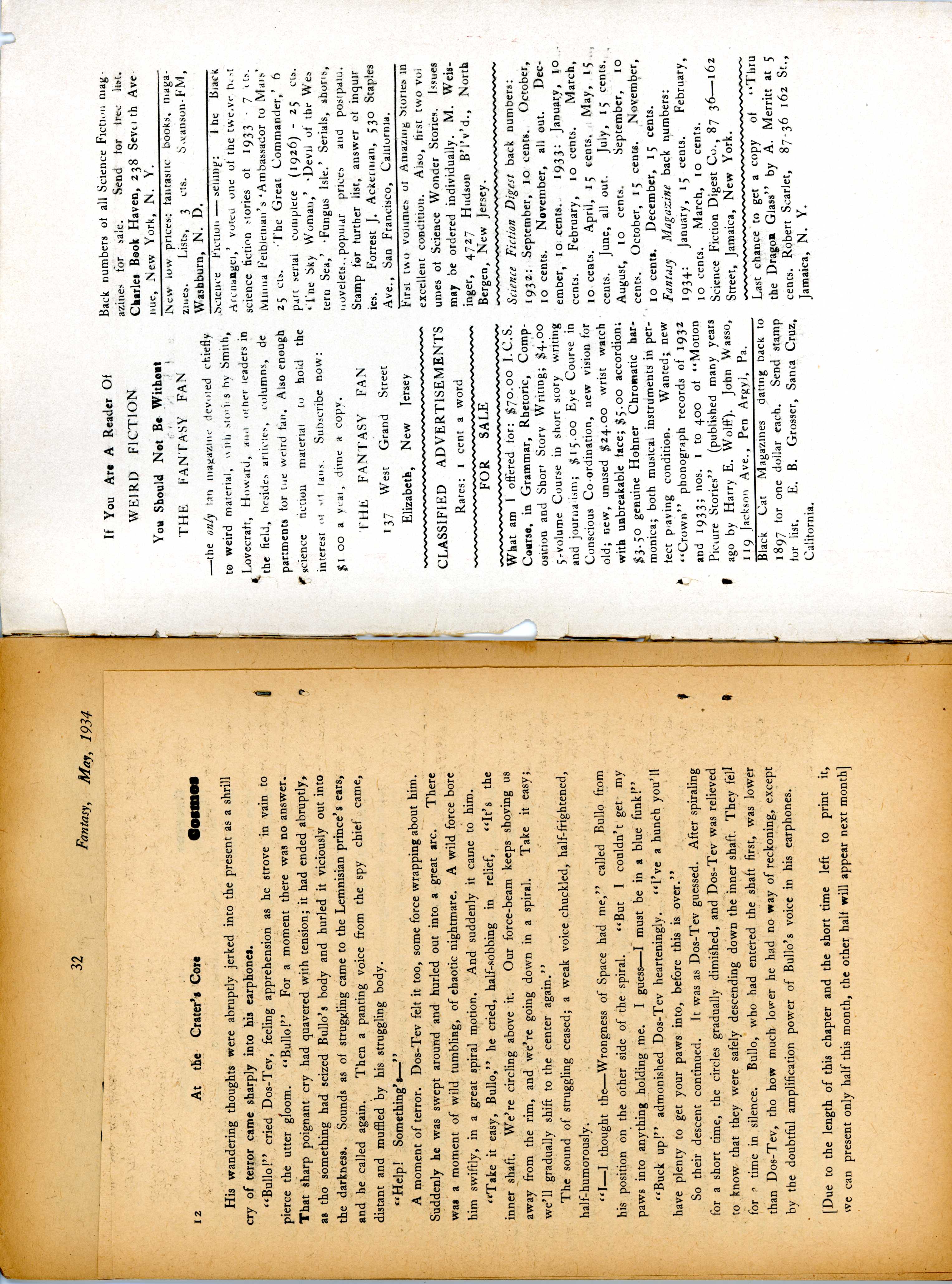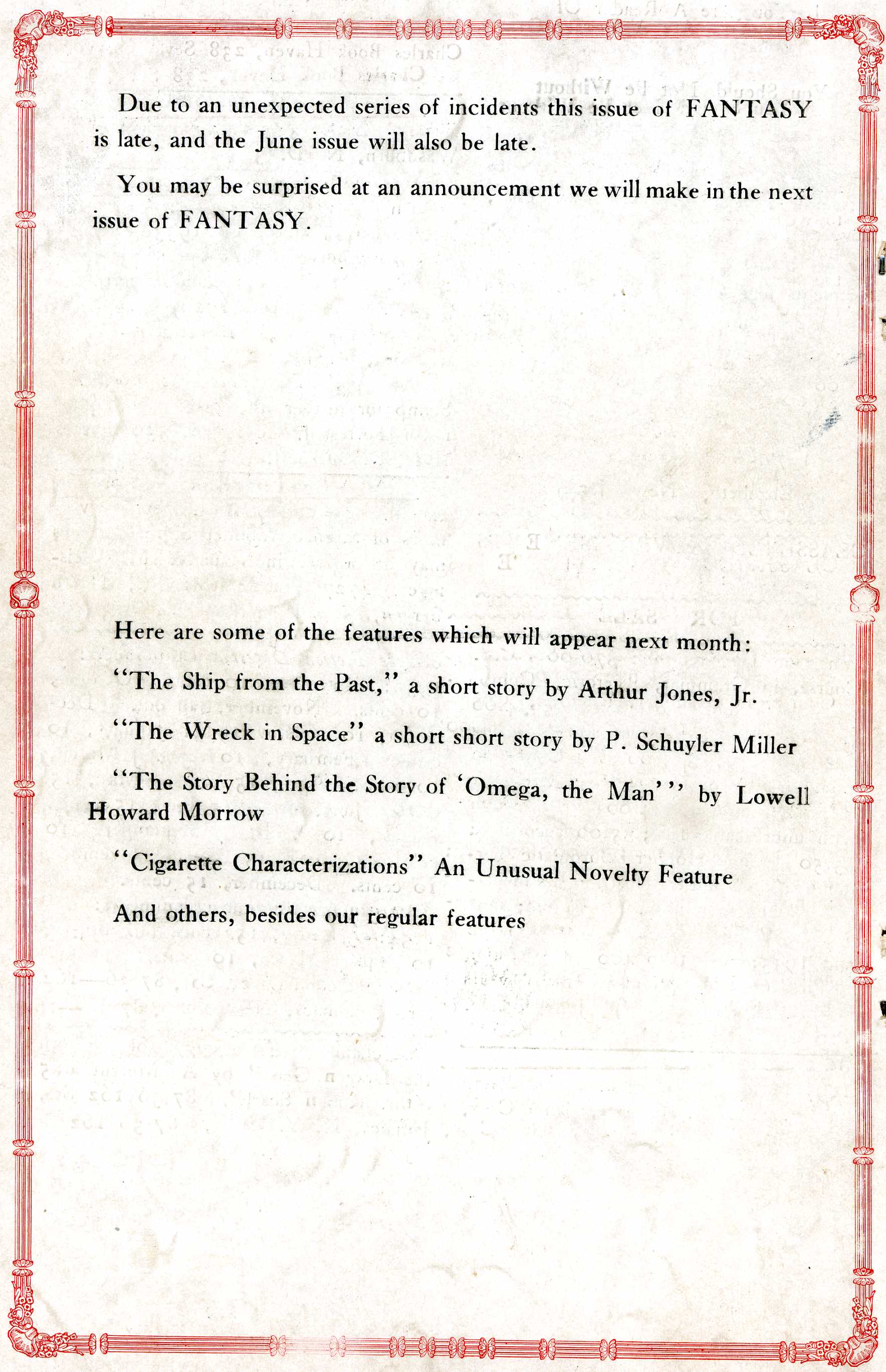 The editors were apparently facing serious challenges during the spring and summer of 1934. The May issue arrived late, and contained only the first half of the Cosmos chapter slated for the month. The problems were discussed in the June issue.