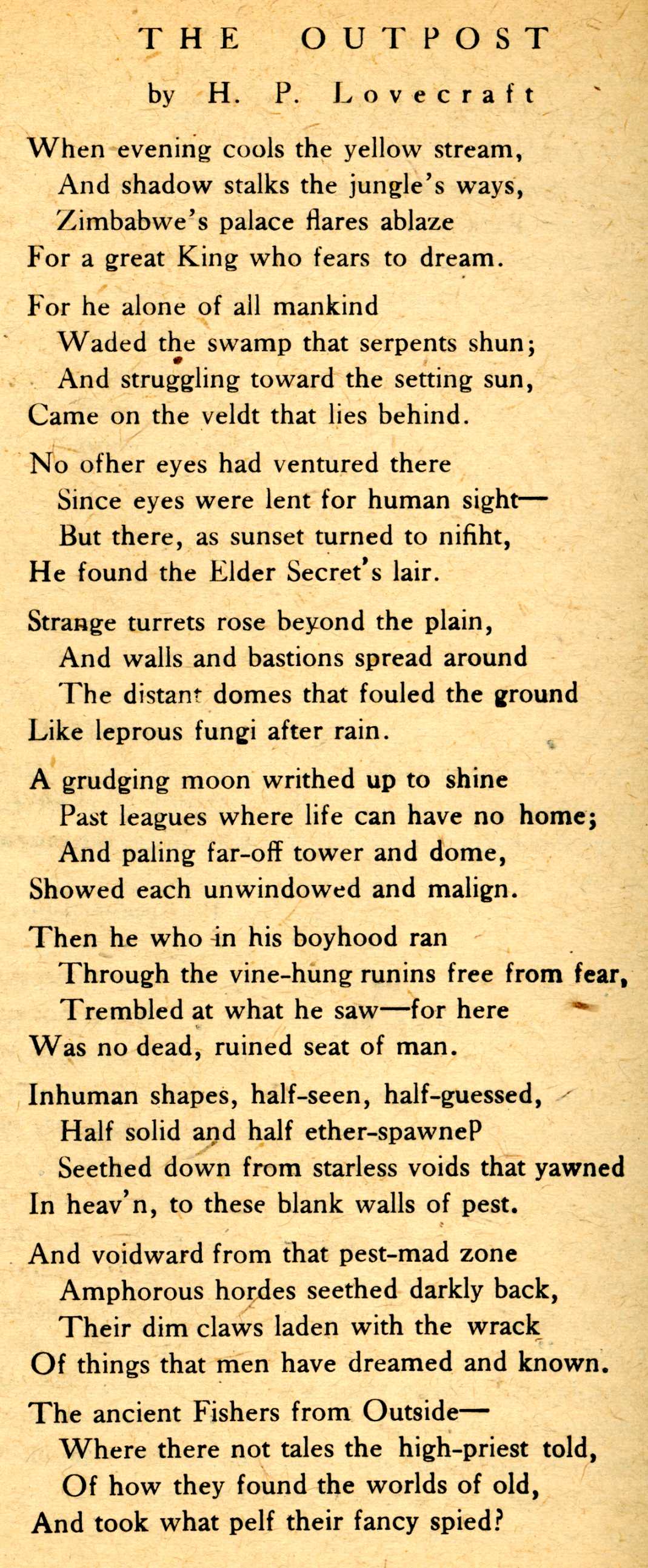 Tales. “The Outpost” had first appeared in 1930 in an amateur press pamphlet called Bacon’s Essays, edited by his friend Victor A. Bacon. Much of the early work of Lovecraft and his contemporaries was first published through a close-knit network of amateur journals before appearing in professional venues.