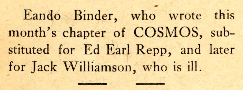This issue’s Cosmos chapter featured yet another substitute author. This was announced tersely in Ray Palmer’s column. “Eando Binder” was the pseudonym adopted by a pair of brothers who wrote collaboratively, Earl Andrew and Otto (E-and-O) Binder.
